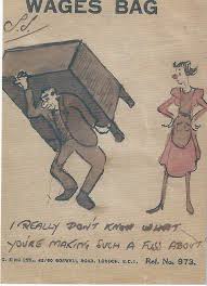 Upon examination the box was found to contain hundreds of cartoons drawn by Ab on the back of his wage packets, starting in 1926 with the first very simple sketch he had made for his new wife Celie. From that point the sketches grew more ambitious and provided a real piece of social history as they covered family joys and arguments (broyguses – as Danny described them in Yiddish), births and celebrations, holidays (usually in the rain) on the south Essex coast, the menace of Hitlerism, the war and the blitz in London, marital disharmony and recovery, and Ab’s retirement. After his retirement, the wage packets ceased, and he bought packets of similar sized card from Smith’s. Thereafter the cartoons became more extravagant, including the use of colour, until the death of Celie (a few years before Ab’s own), whereupon his artistic efforts ceased entirely.